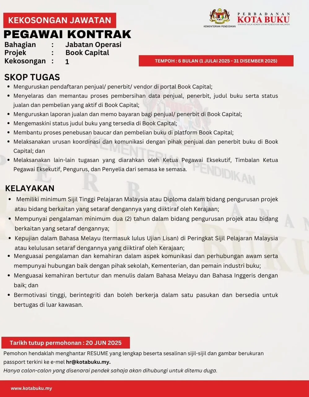 Emelkan permohonan anda lengkap berserta resume dan surat sokongan kepada hr@kotabuku.my